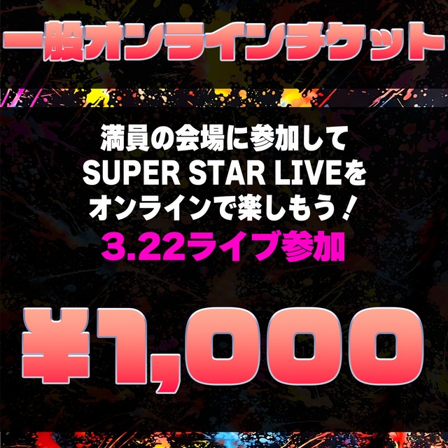 2024,3/22 @ 浅草橋MANHOLEにて行われる〔SUPER STAR LIVE〕 オンライン参加チケット SUPER STAR LIVEのオンラインチケット、販売開始! このチケット1枚で、あなたもお茶の間からアーティストの熱いステージを間近で体感できます。 当日、オンラインで最高のエンターテイメント そして挑戦することへの素晴らしさ を思う存分楽しめるチャンスです。 SUPER STAR LIVEは 音楽との距離を縮め、自己表現を音楽でもやっていきたいという参加者を募って実現したLIVEであり、音楽業界では初の試みでもある部分が要素としてたくさん詰まったLIVEイベントです。 そんなチャレンジを経て紡ぎ出された音楽とパフォーマンスを体感してください。 熱気溢れるイベント会場で、素敵な思い出をたくさん作ることができるでしょう。 このチケットがあなたにもたらす感動と刺激、 そしてスリリングな夜を楽しみにしてください。 一緒にSUPER STAR LIVEの素晴らしさを共有しましょう! スケジュール 17:30開場 18:00開演予定 ※配信は専用アカウントにて行います。 ※チケット購入後メールにてアカウントへの招待URLをお送りします。 ※当日のタイムスケジュールについては、各SNSをご確認ください。 ※お申し込み、決済後のキャンセルに係る返金等は一切受け付けていませんのでご了承ください。